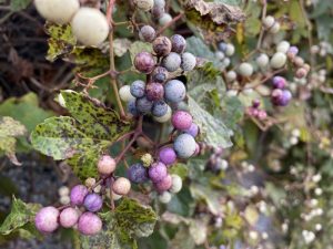 今、AIさんに写真を見せたところ、どうやらこれは野葡萄(のぶどう)らしいのですが、食用には適さないとのことで、実を食べると人によってはお腹を壊すことがあるそうです。