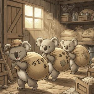 以下はGeminiさんに描いてもらった『ここの古古古米を個々に運ぶ子コアラ』のイラストです。